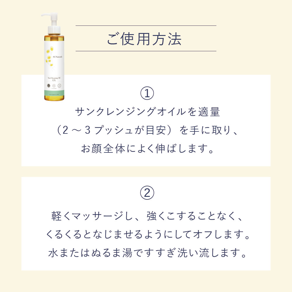 | 【ご使用方法】 | ご使用方法 その1 サンクレンジングオイルを適量(2〜3プッシュが目安)を手に取り、顔全体に優しくこすらず軽くマッサージするように洗います。 その後、水またはぬるま湯で十分にすすぎます。お肌の状態やメイクに合わせて量を調節してください。 ご使用方法その2 「水でぬらした後絞ったコットン」に、クレンジングオイルをたっぷり含ませます。メイクをした部分をこすらず優しく拭き取ります。 |