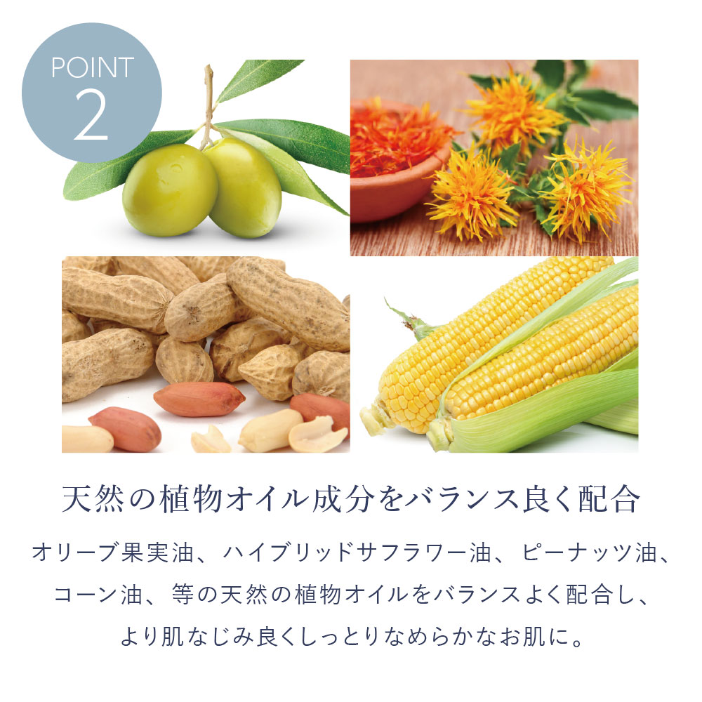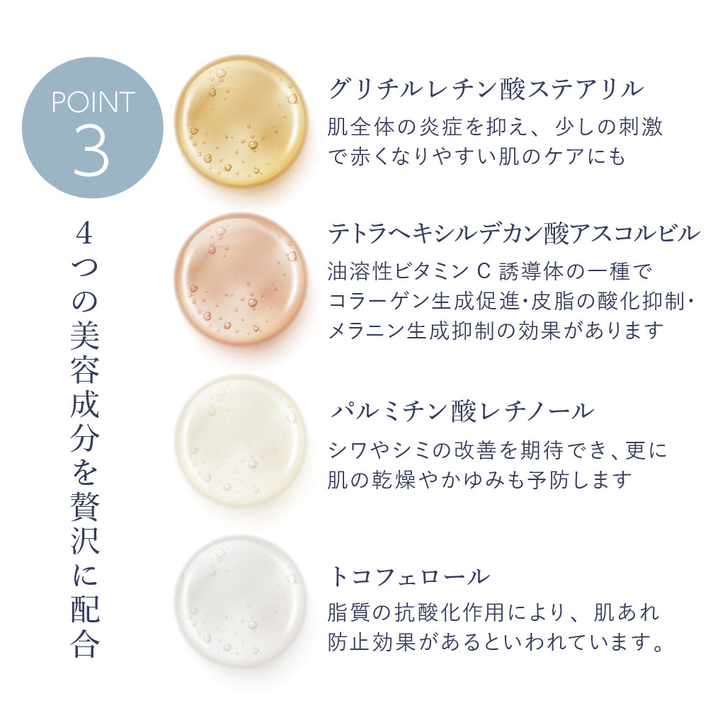 ホホバ種子油、オリーブ果実油、ハイブリッドサフラワー油、トリイソステアリン酸PEG-20グリセリル、ビサボロール、グリチルレチン酸ステアリル、テトラヘキシルデカン酸アスコルビル、パルミチン酸レチノール、ピーナッツ油、コーン油、トコフェロール