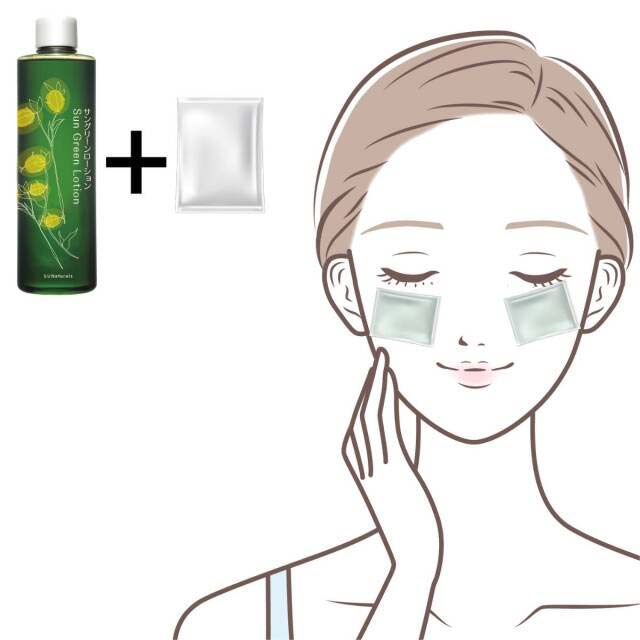 | 【ご使用方法】 | 洗顔後、手の平あるいはコットンにサングリーンローションを適量(500円玉硬貨サイズが目安)を取り、顔全体に優しくなじませます。お肌にしっかり入れ込むために、なじませた後、ハンドプレスすると効果的です。 日焼けした時やお肌の状態に合わせて、週に1〜2度のサングリーンローションパックもおすすめです。 |