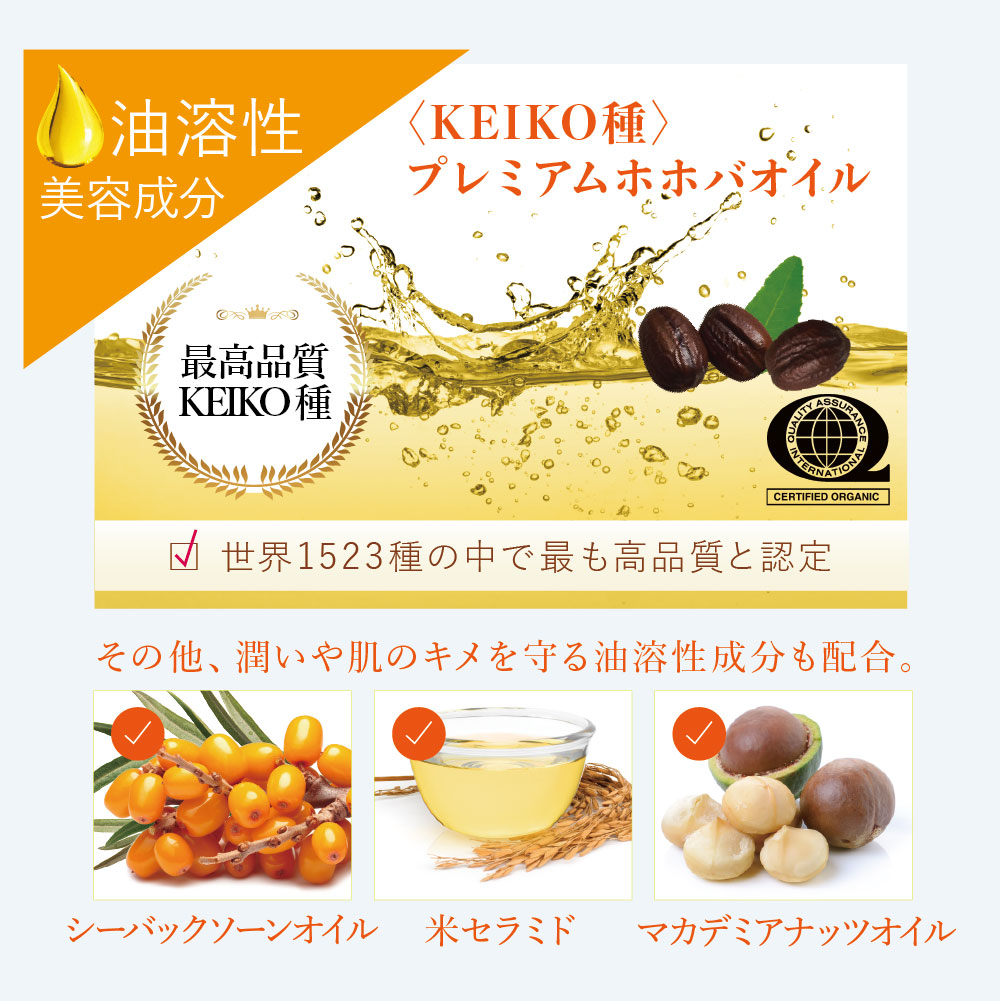 米国医学博士が開発した「KEIKO種」だけを使用したプレミアムホホバオイルと灼熱の砂漠で生き抜くホホバという植物の葉のエキスを凝縮ゲルにした美容液。