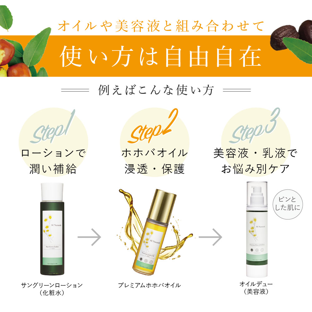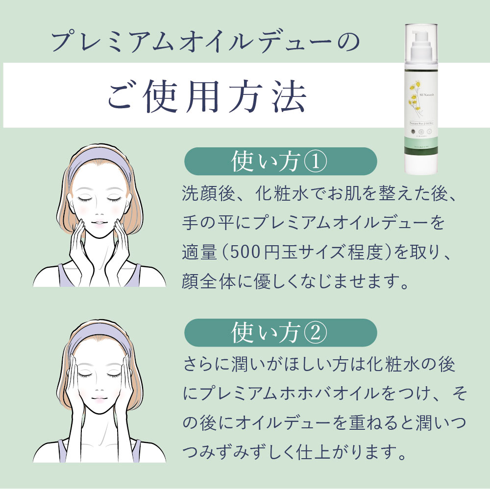 | 【ご使用方法】 | 適量を指先(または手のひら)にとり、お顔に軽く伸ばしマッサージするようにしてご使用ください。肌質や季節に合わせてご使用量は加減してください。 《使用順》洗顔 → 化粧水 → ホホバオイル → スーパーJオイルデュー(目安2〜3プッシュ) |