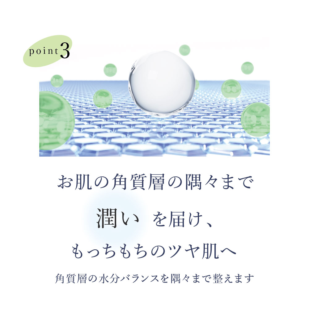 肌の上でとろりと溶けて液状になります。みずみずしく伸びて、肌にハリ・ツヤ・キメ・潤い・やわらかさを与えてくれます。