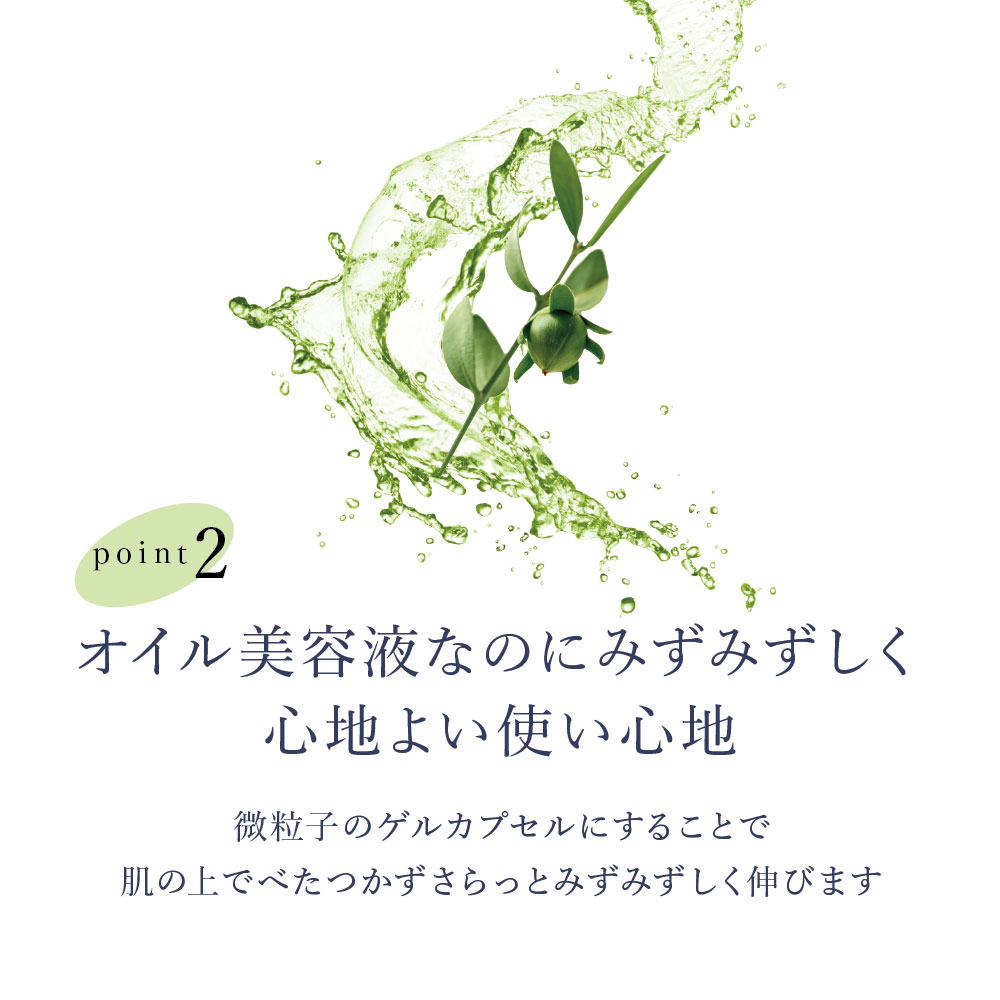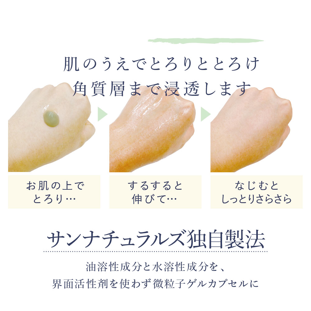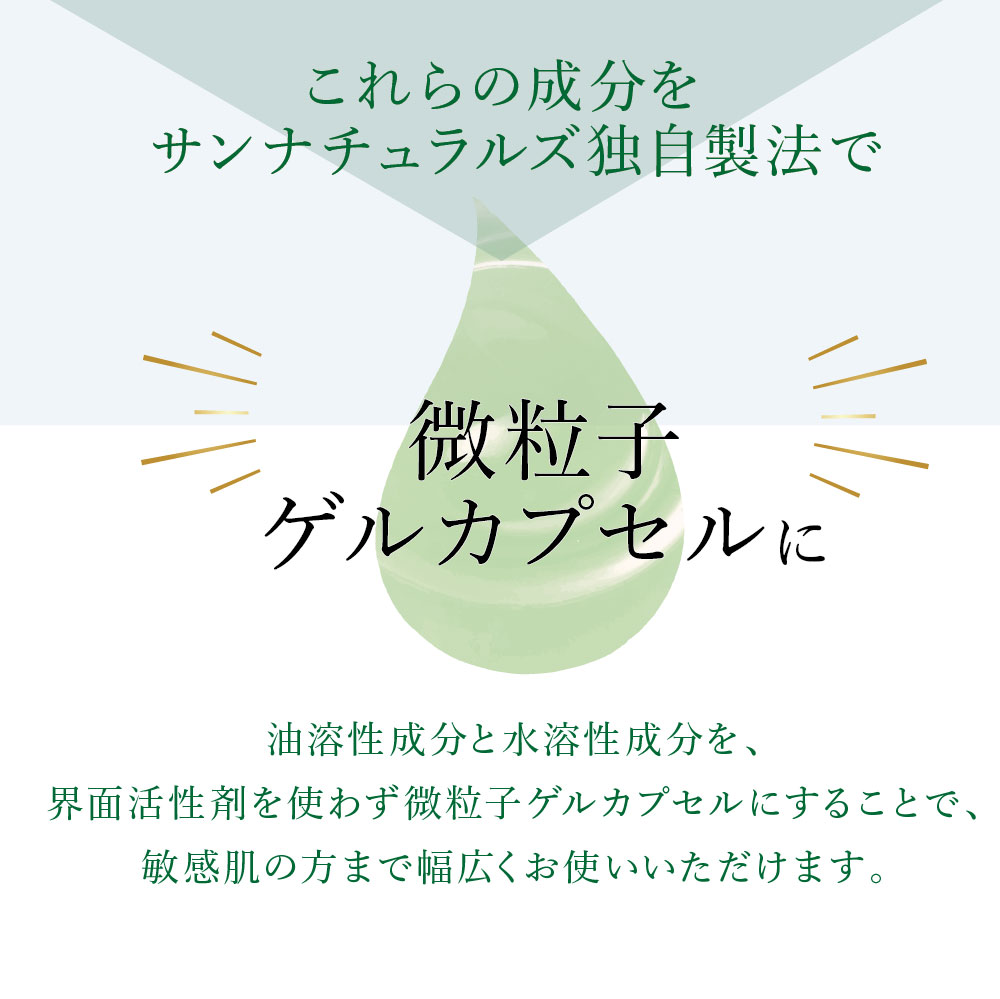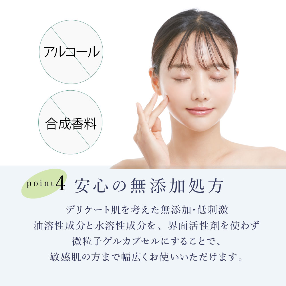 脂溶性成分と水溶性成分を界面活性剤を使わずに独自製法の微粒子ゲルカプセルにすることで敏感肌の方まで幅広くお使いいただけます。無香料なので、香りの苦手な方もオススメです。