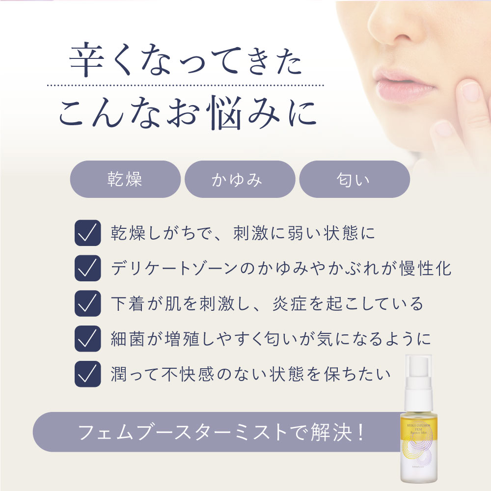 | 【ご使用方法】 | トイレットペーパーにフェムブースターミストを吹き付けて、デリケートゾーンを軽く拭いてください。サニタリーパッドにフェムブースターミストを吹き付けての利用もオススメです。 |