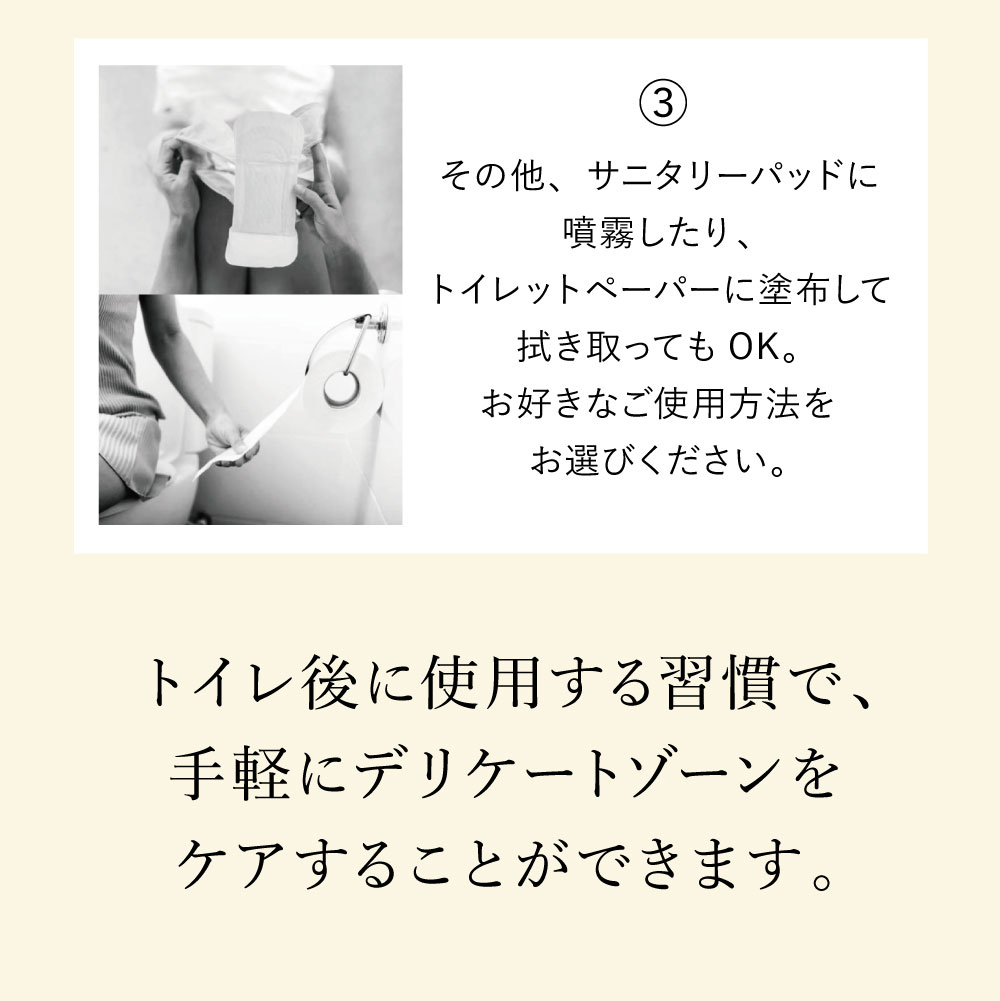 さらに、超微粒子ファインミストで、繊細なデリケートゾーンに優しく心地よくお使いいただけます。トイレットペーパーやサニタリーパッドに吹き付けて、気軽にデリケートゾーンのケアが可能です。