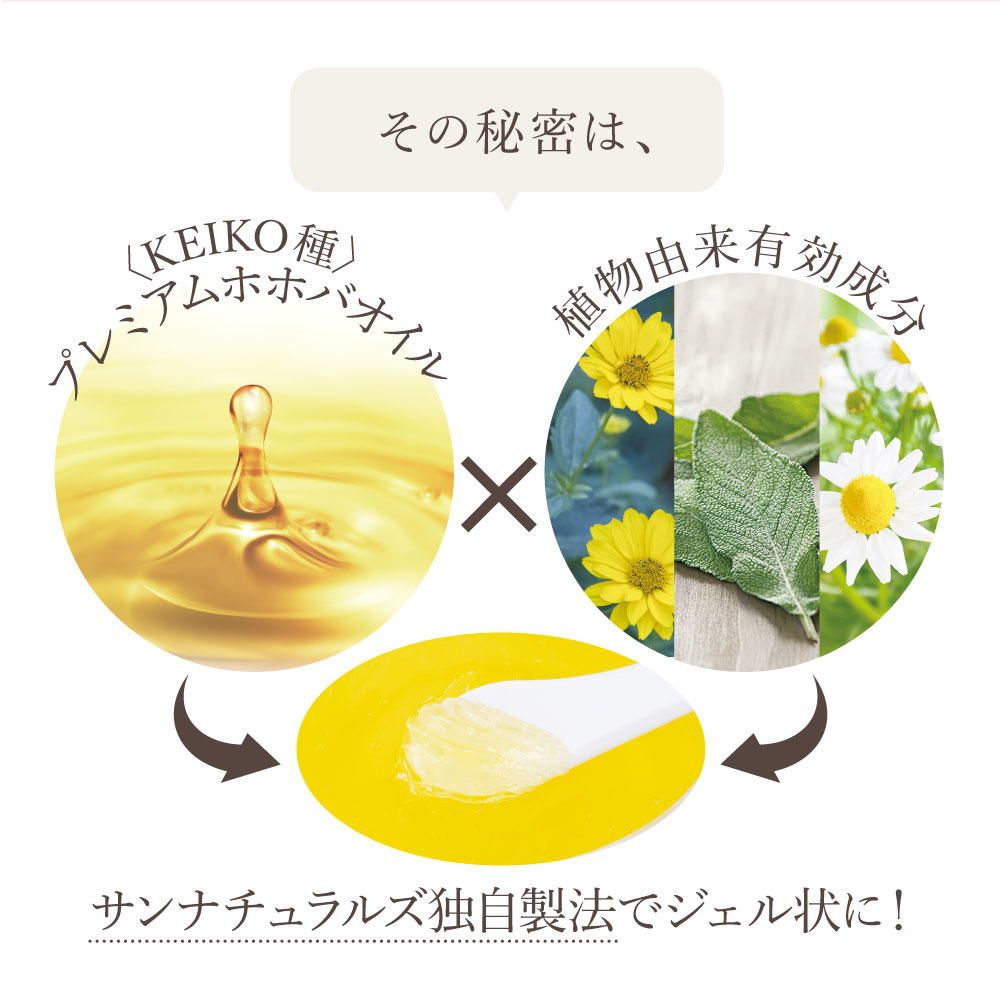 米国医学博士が開発した「KEIKO種」だけを使用したプレミアムホホバオイルをミツロウを使わず脂溶性デキストリンによって独自製法で凝固させた保湿ジェルです。