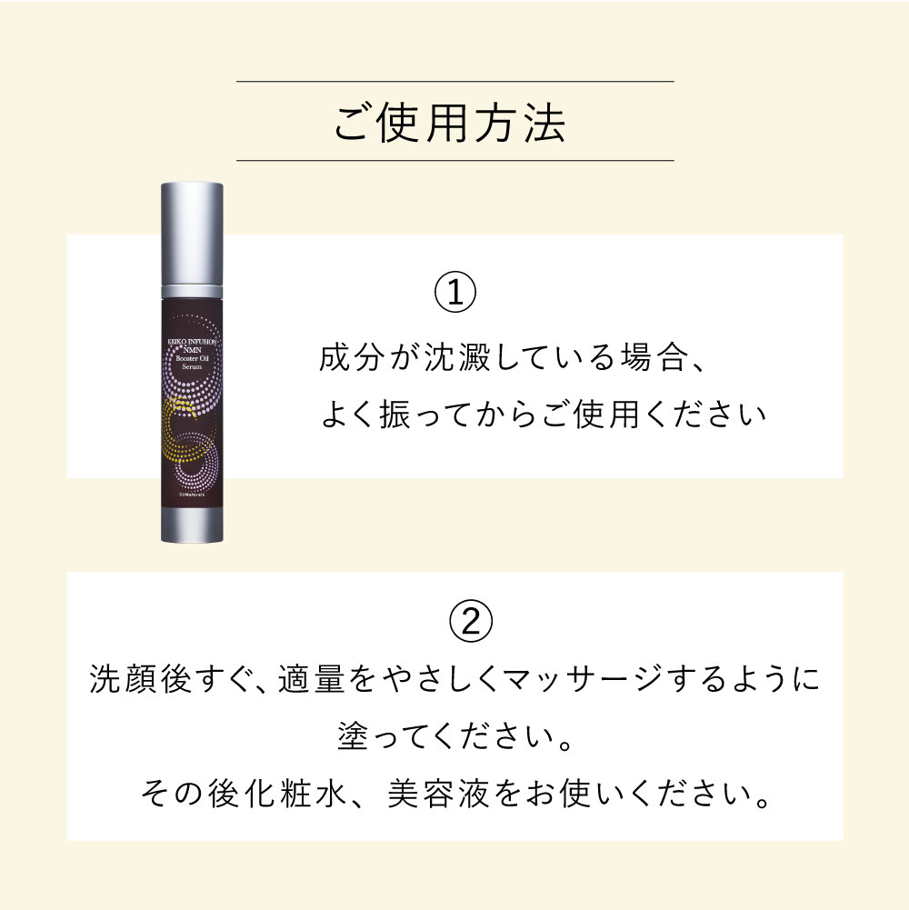 幹細胞エキス、ナイアシンアミドに次ぐ、第三世代アンチエイジング成分として世界中が注目するNMNをマイクロカプセルに内包し、KEIKOプレミアムホホバオイルに注入することで、NMNを生きたまま肌のすみずみまで届けることに成功した世界初のブースターオイル。洗顔後のスキンケアに使うことで肌に活力を与えます。