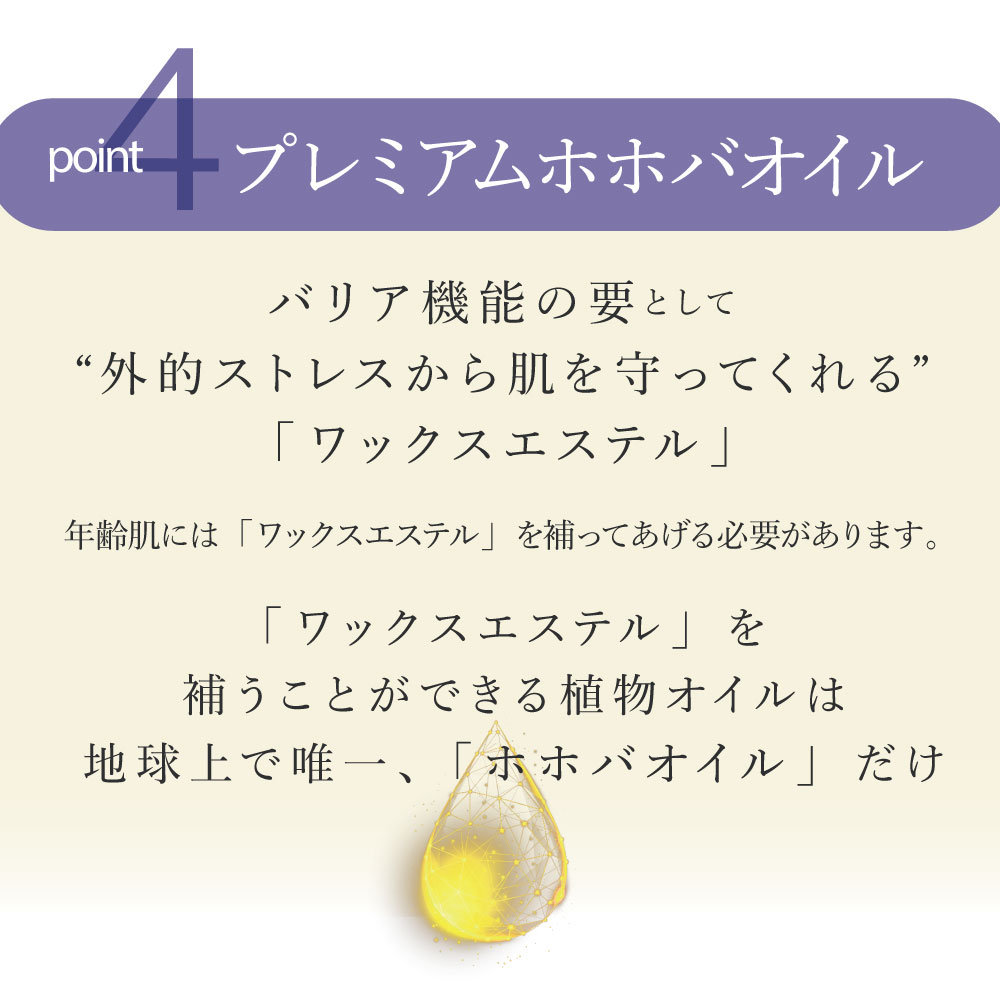| 【成分】 | ホホバ種子油、オクタデカ(ベヘン酸/ヒドロキシステアリン酸)ポリグリセリル-20、シリカ、ニコチンアミドモノヌクレオチド、水添ホホバ油、アルピニアウライエンシス葉油、オーランチオキトリウムリマシヌム油エキス |