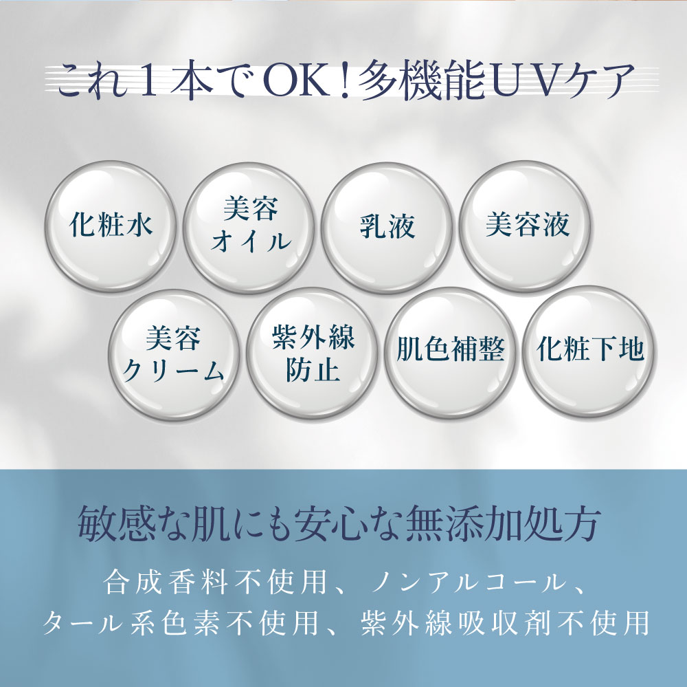 プレミアムホホバオイルとビタミン成分が潤いとツヤを与え、紫外線ダメージケアしながら、UVカットします。日中スキンケアでお使いいただくだけで、メイクをしたくない時でも、しっかりキメを整えながら、ツヤのある美しい肌へ導きます。