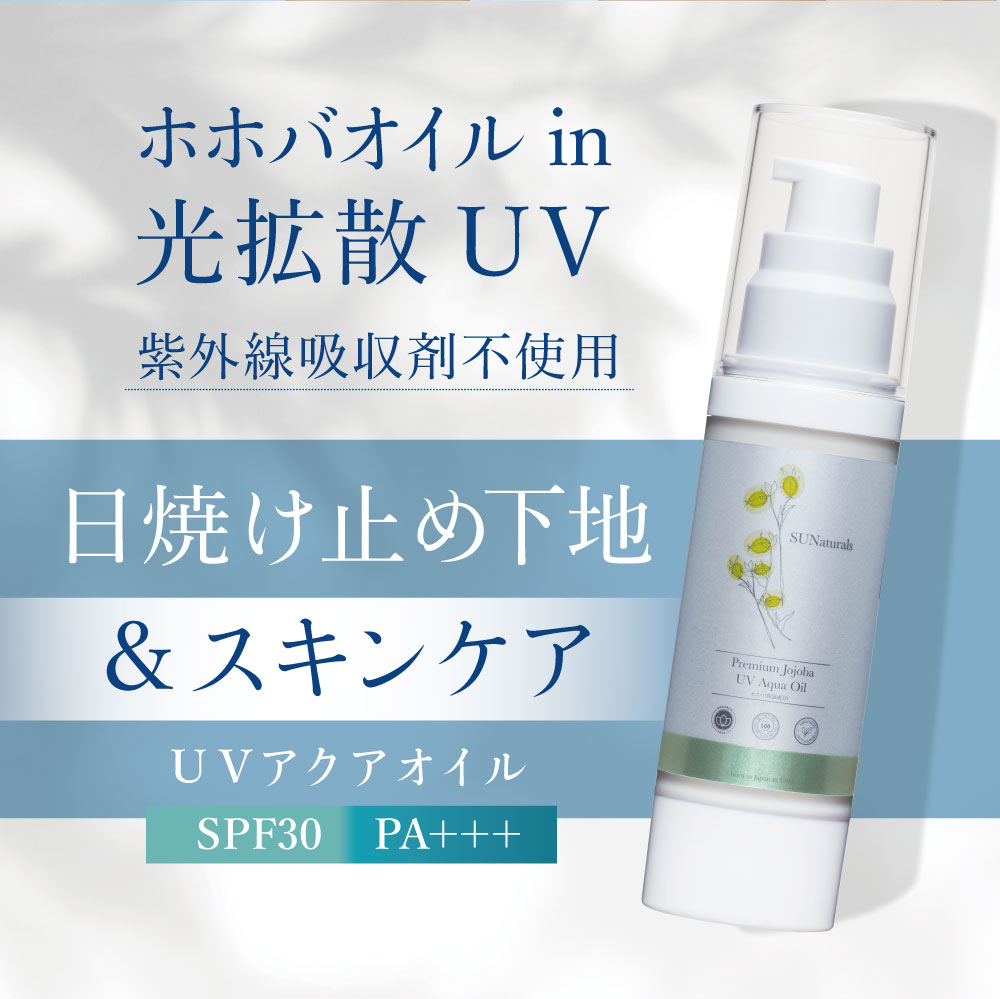 プレミアムホホバオイルが30%高配合で、ハリ・ツヤ・キメ・潤い・やわらかさをあたえながら、UVカットも可能に。