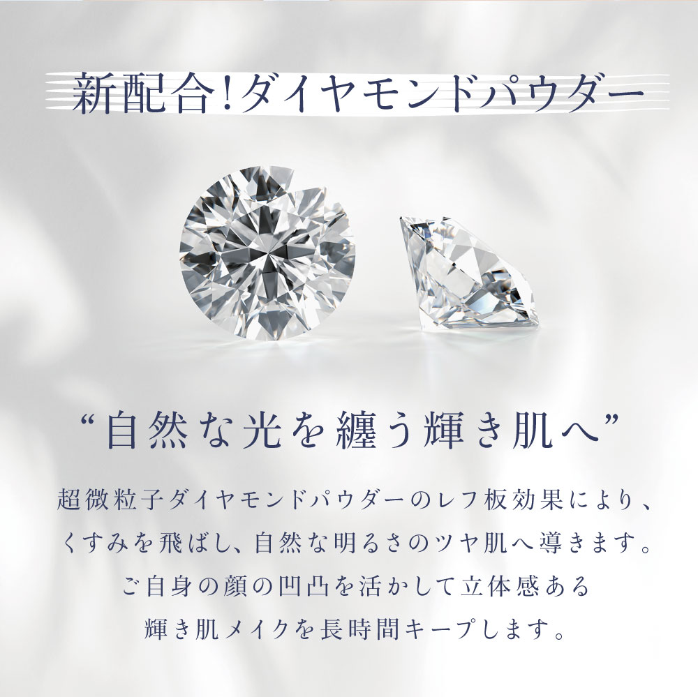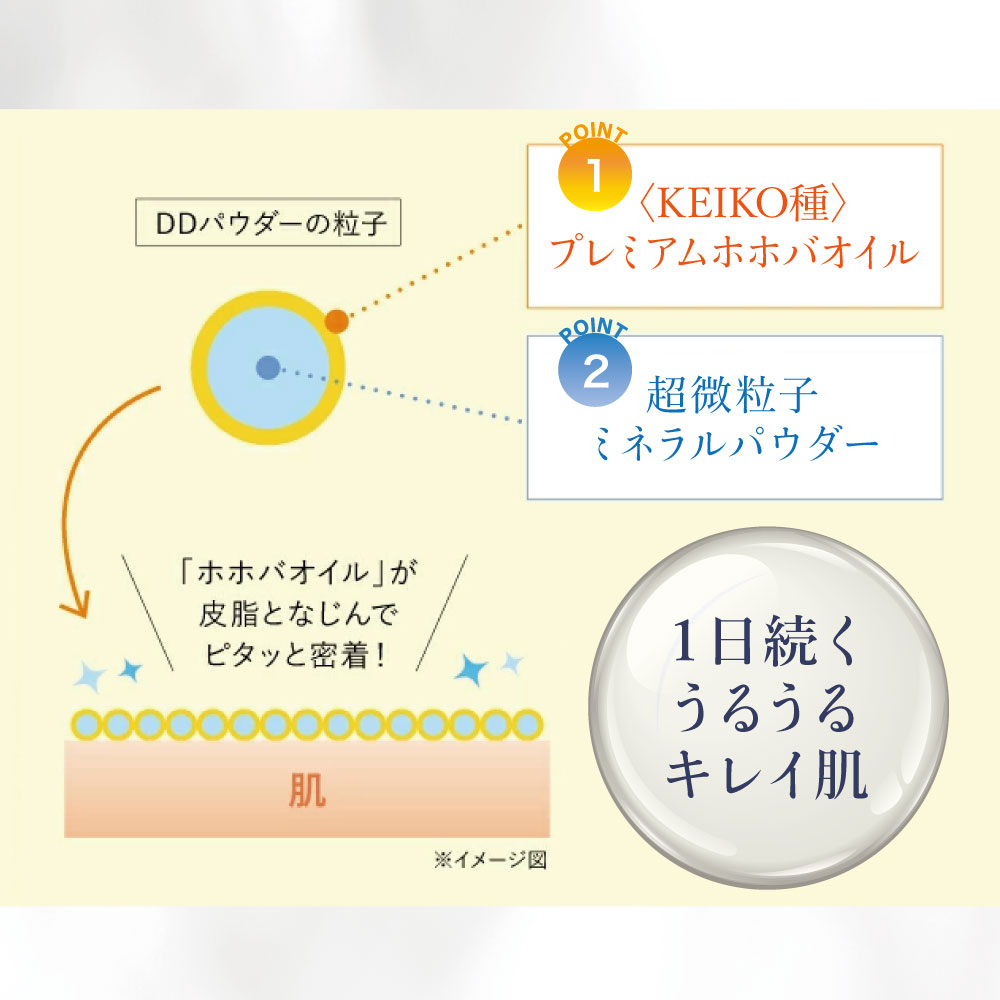 ミネラルパウダーをプレミアムホホバオイルで包み込んだ乾かさないパウダーファンデーション。皮脂に不可欠な美肌成分「ワックスエステル」。米国医学博士が開発した「KEIKO種」だけを使用したプレミアムホホバオイルでミネラルパウダーをコーティングすることで乾きにくい美肌メイクに仕上げます。また、プレミアムホホバオイルがミネラルパウダーをしっかり肌へ密着させることで、メイク崩れすることなく素肌のような仕上がりを実現します。SPF40・PA+++で紫外線もしっかりカット(紫外線吸収剤不使用)。さらにダイヤモンドパウダーによるレフ版効果で、肌を明るく演出し、ご自分の顔の凹凸を生かして明るさとツヤ感のある肌に仕上げます。