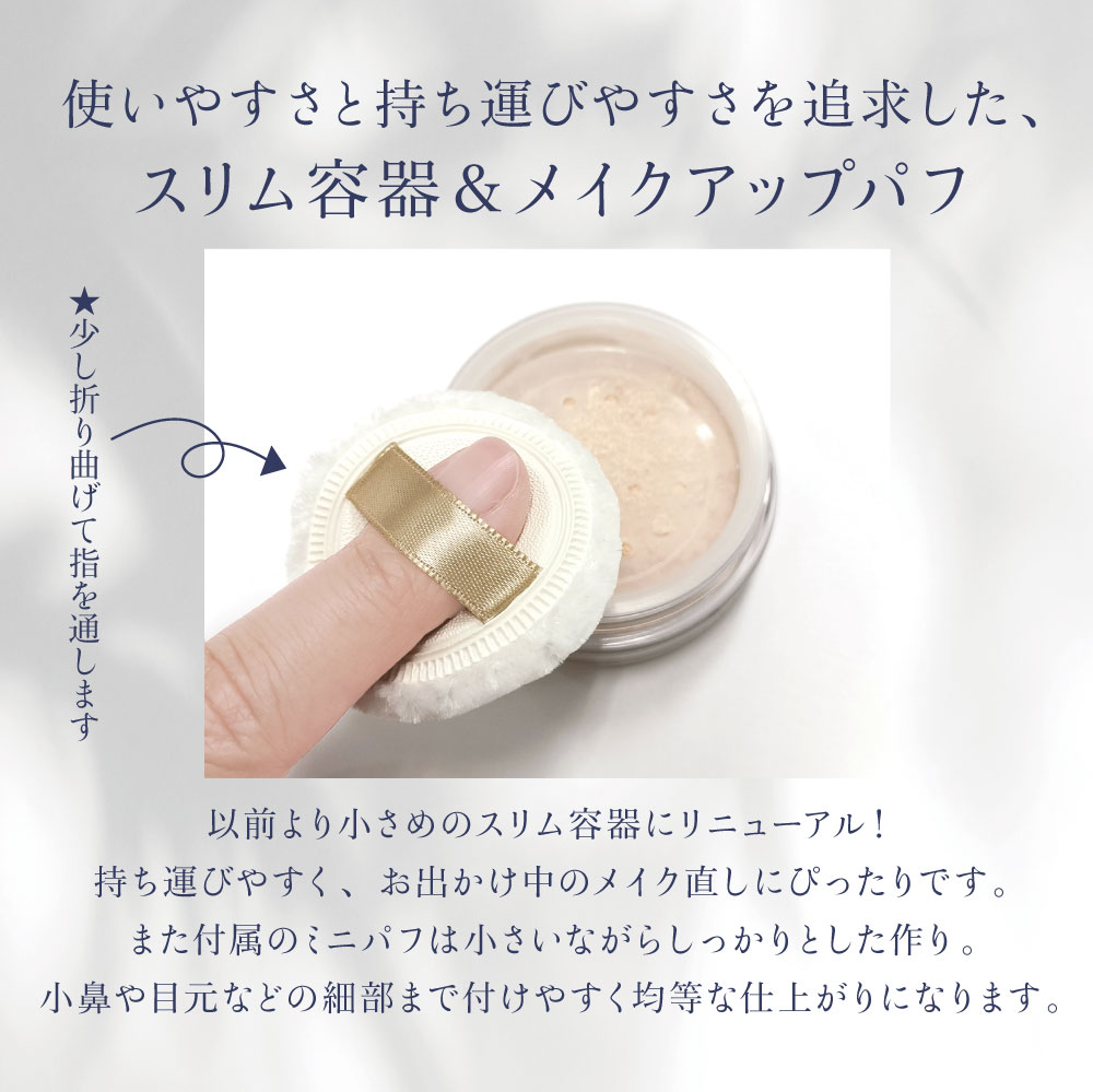 【ご使用方法】 パフを少し折り曲げてリボンに指先を通します。パウダーを適量含ませ、お顔全体に優しく塗布します。ミニサイズなので小鼻や目元までムラなく均等につけられます。軽くポンポンと押さえるように塗布するのがコツです。