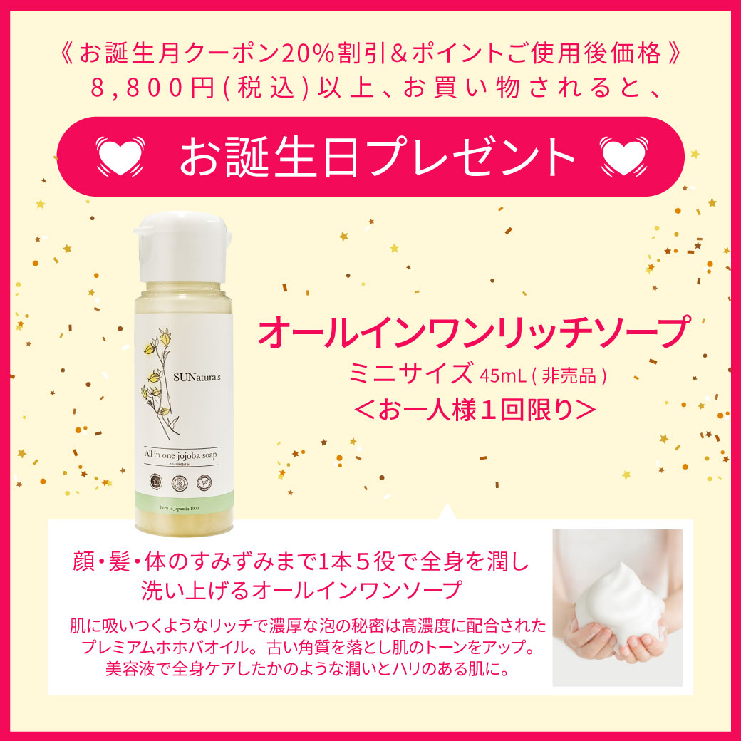 ささやかではありますが、サンナチュラルズからのお誕生月プレゼントとして、「バースデー送料無料チケット」をプレゼントします!